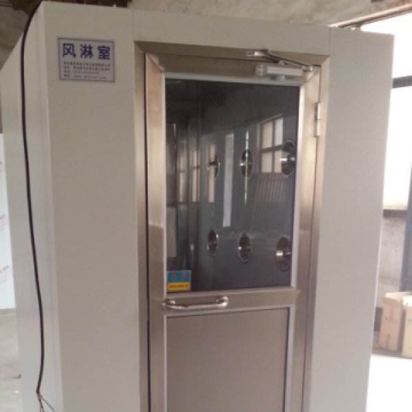 風淋室內的空氣由風機的作用經初效過濾器進入靜壓箱,經高效空氣過濾器過濾后,潔凈空氣從風淋室的噴嘴高速噴出,噴嘴角度可調節,可有效地吹除人、身或攜帶物品表面附著的塵埃,吹下的塵埃再回收進入初效空氣過濾器,如此循環可以達到風淋除塵凈化的目的??梢杂行У那宄獠咳藛T進入潔凈區所帶來的污染問題,并同時起到氣閘室密閉潔凈室的作用。風淋室通用性強,可與所有的潔凈室與潔凈廠房配套使用。